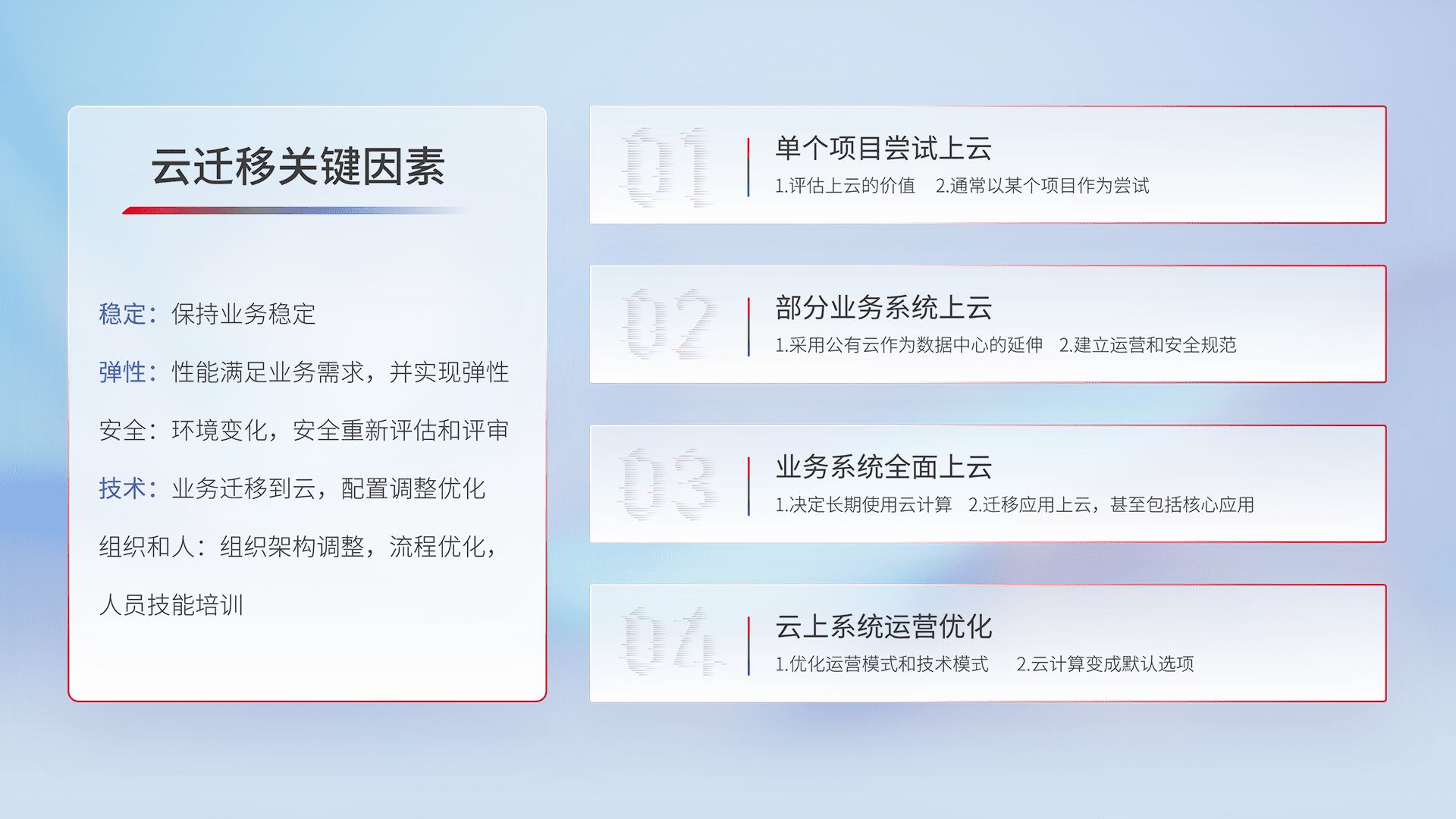 结合实际业务,,,从规划设计、、云平台选型、、、云原生改造、、数据迁移、、集成交付,,迁移全过程为客户识别最佳上云路径,,,,做好风险识别管理,,设计网络架构、、、、身份权限、、、安全审计合规、、、操作审计、、日志审计、、、监控告警策略、、、多站点容灾设计等,,对云上基础设施进行整体规划,,,提升IT治理水平,,,,以满足弹性、、、高可用、、高性能的需求。。。。