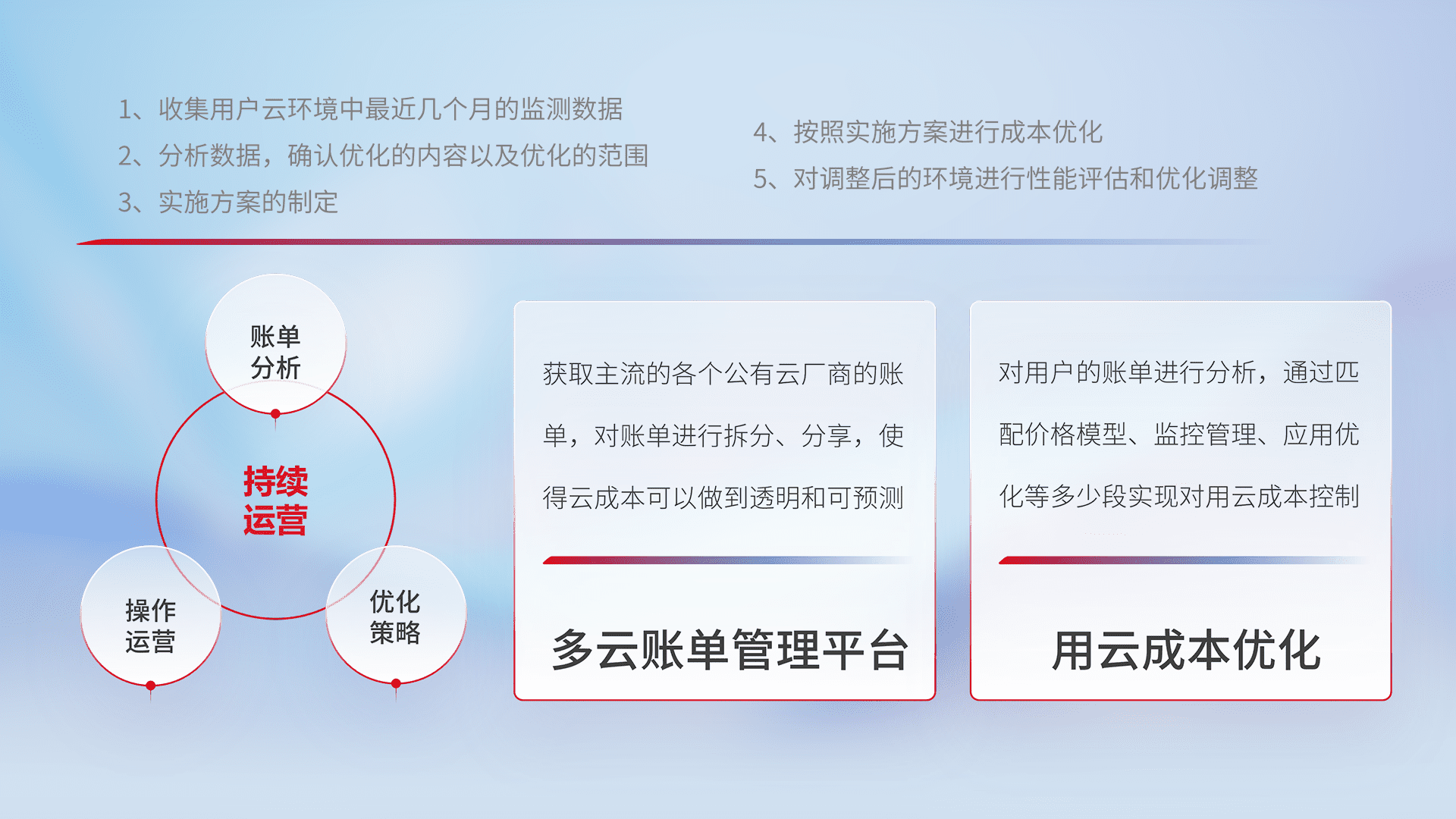 通过多云纳管,,,,以统一的资源数据模型把客户的云资源进行抽象和封装,,进而实现对多云资源的统一操作,,,,保障云资源管理的可靠性、、、、稳定性与可用性。。量身定制化运维内容,,,配置、、开发运维、、补丁管理、、、、备份、、监控、、认证和访问管理、、、、审计和日常巡检等,,,保障在用云过程中的可靠度,,,稳定度以及高可用率。。